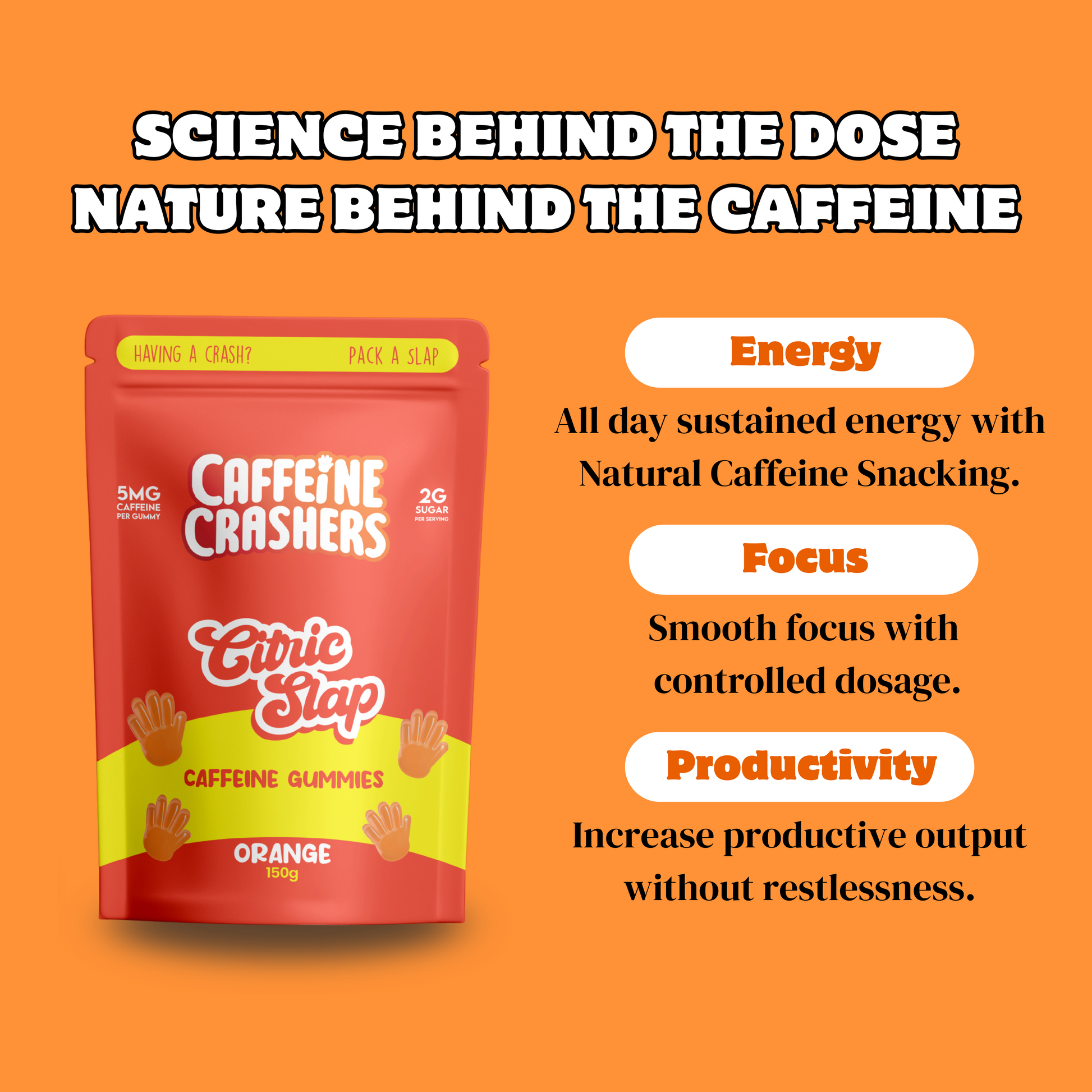 Zesty Orange flavour meets clean focus. All the lift of a morning espresso, none of the jitters. Our Orange Gummies deliver a precise, gentle energy kick without the crash or the sugar spike of energy drinks.